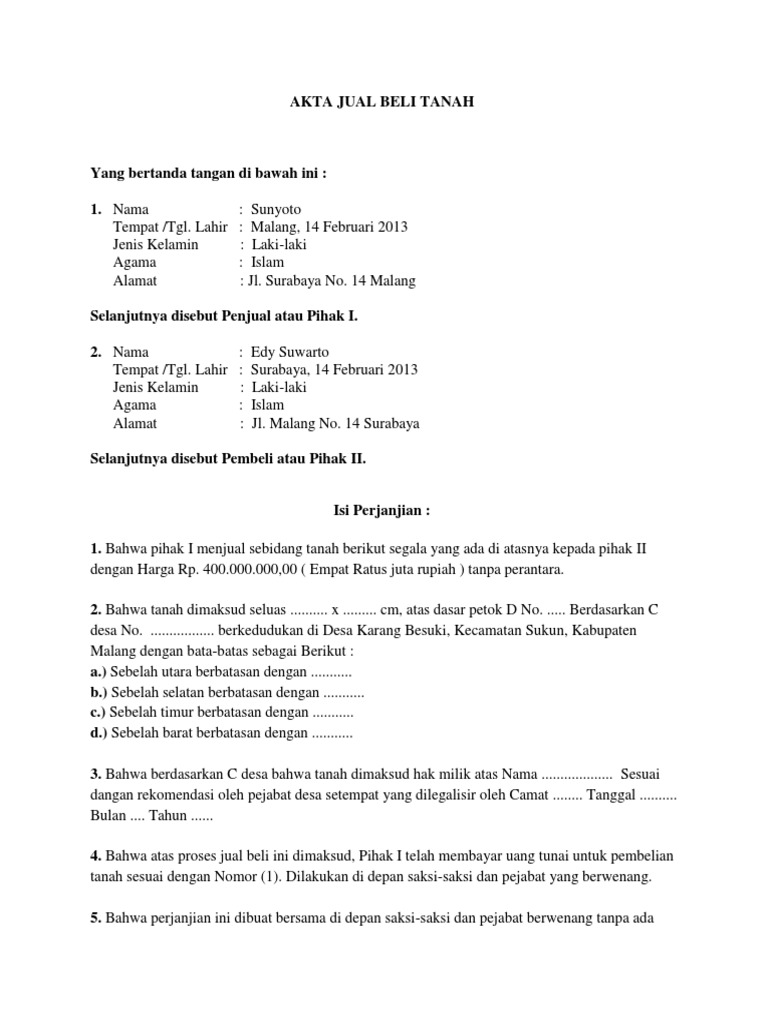 Pembatalan Jual Beli Tanah Karena E from s1.studylibid.com Pada ranah jual beli properti, saat pelunasan telah dilakukan, maka kedua belah pihak pun membuat ajb. Artikel di bawah ini adalah pemutakhiran dari artikel dengan judul sama yang dibuat oleh. Dalam proses jual beli tanah, sebaiknya jangan langsung percaya ketika mendengar nominal harga yang ditawarkan oleh penjual karena bisa jadi pihak tersebut menaikkan harga tanahnya dengan sangat tinggi dibandingkan nilai jual objek pajak (njop) di kawasan sekitarnya. Hal ini bersamaan dengan pembayaran harga oleh pembeli yang bersifat terang, tunai, dan juga riil. Pengiriman akta jual beli tersebut paling lambat adalah tujuh hari kerja sejak penandatanganan akta. Jual beli hak atas tanah merupakan proses peralihan hak yang sudah ada sejak jaman dahulu. Karena proses jual beli rumah dapat dikatakan transaksi. Ini bisa dihitung dari jangka waktu sekitar 14 hari pemrosesan pengurusan berkas melalui ppat dan 14 hari proses balik nama yang dilakukan di kantor badan pertanahan nasional.